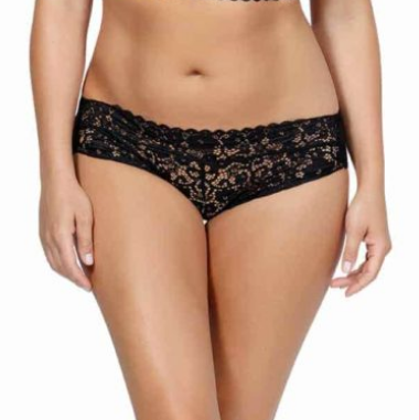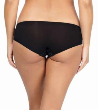 - Low rise hipster style panties with a sheer lace front and soft opaque back.