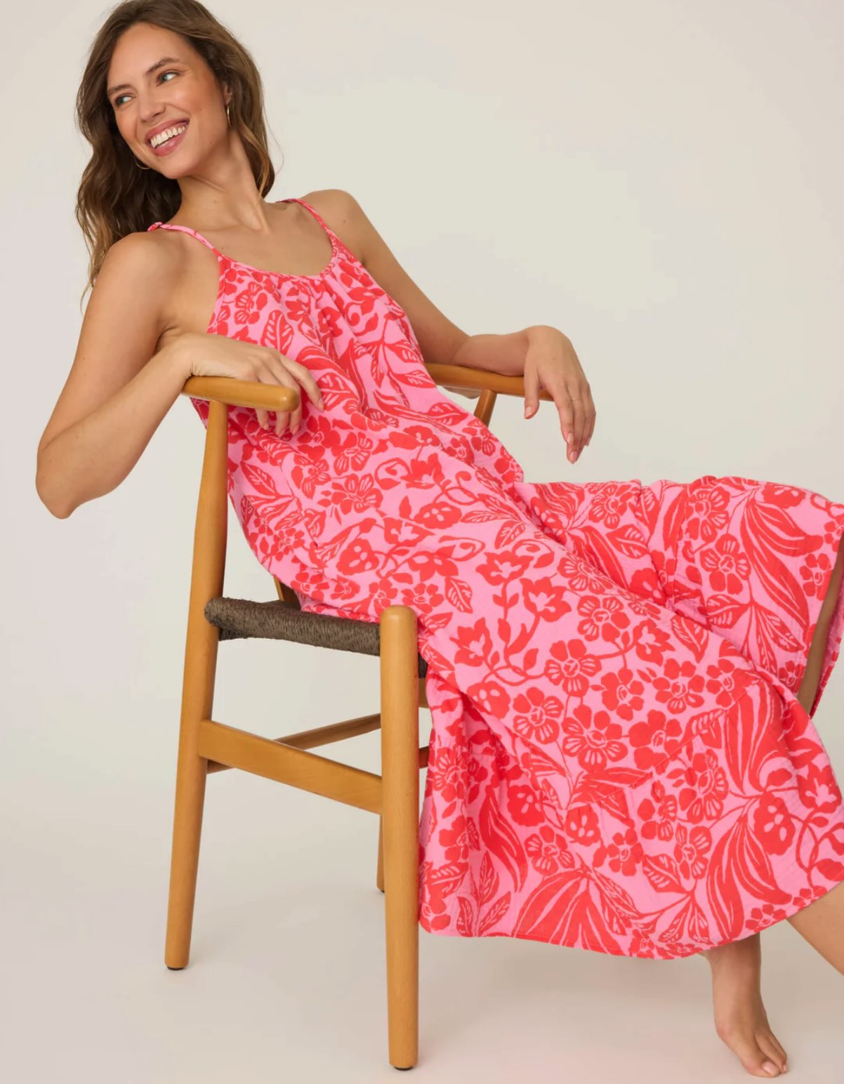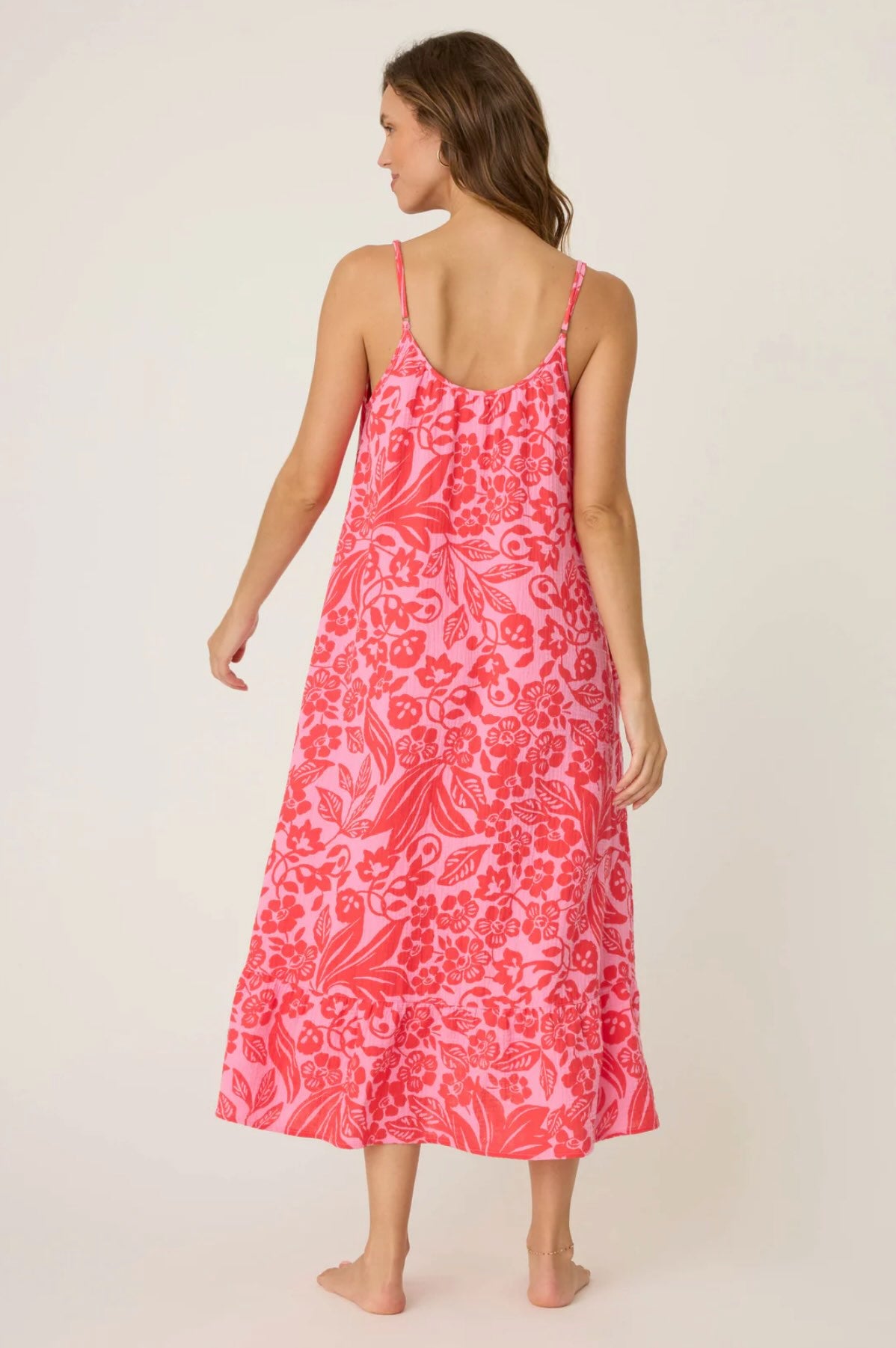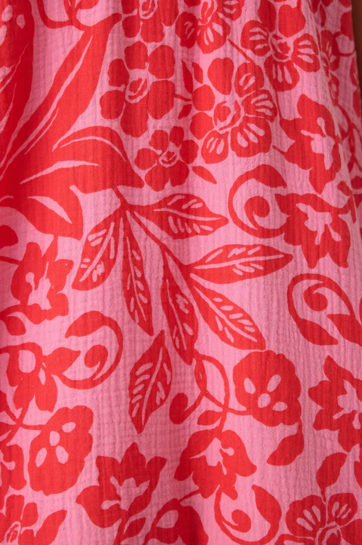 - Breezy, cotton gauze dress in a bold, bright floral with a ruffled hem.