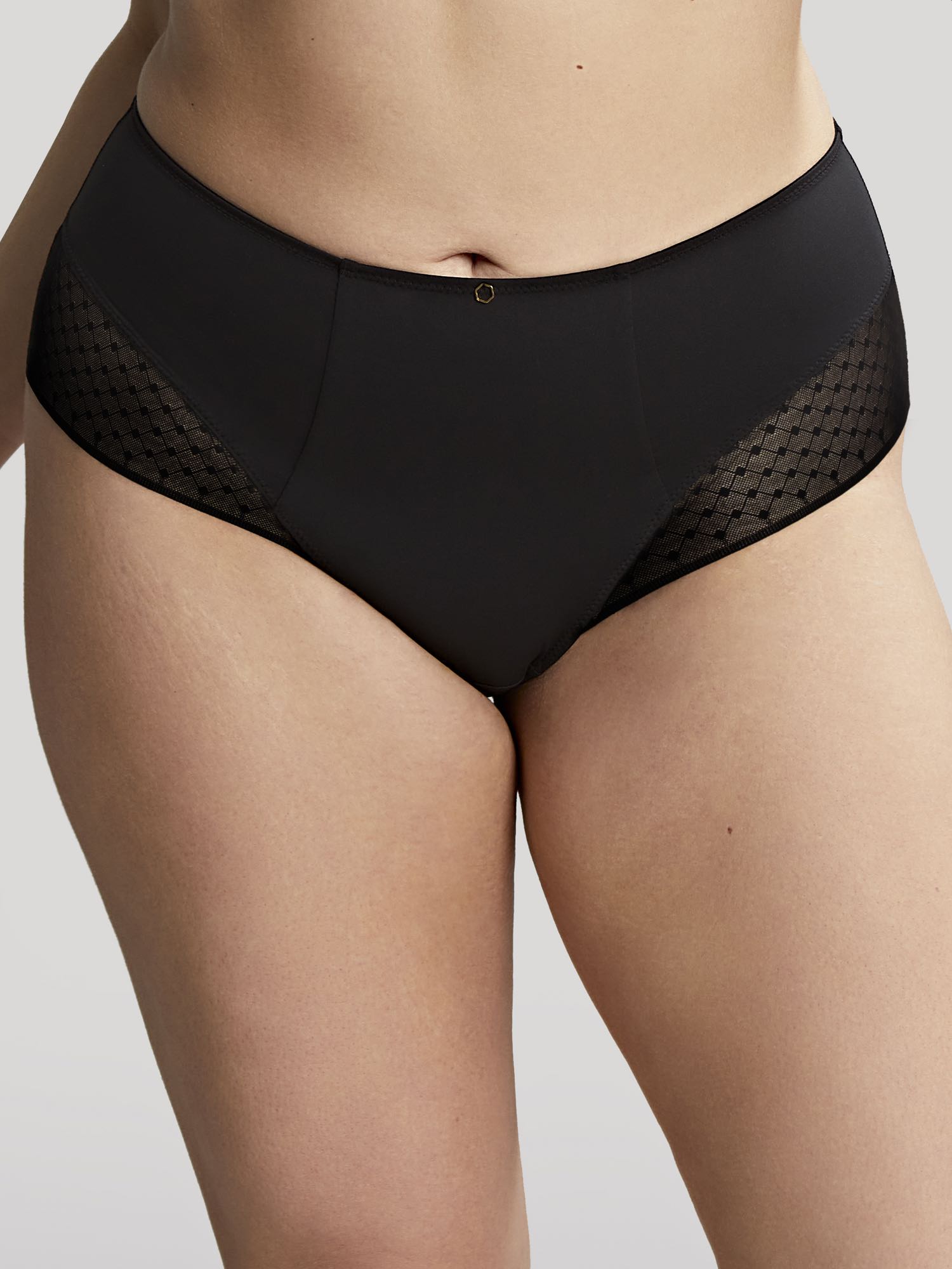 - Full coverage, opaque high waist brief with geometric lace accents.