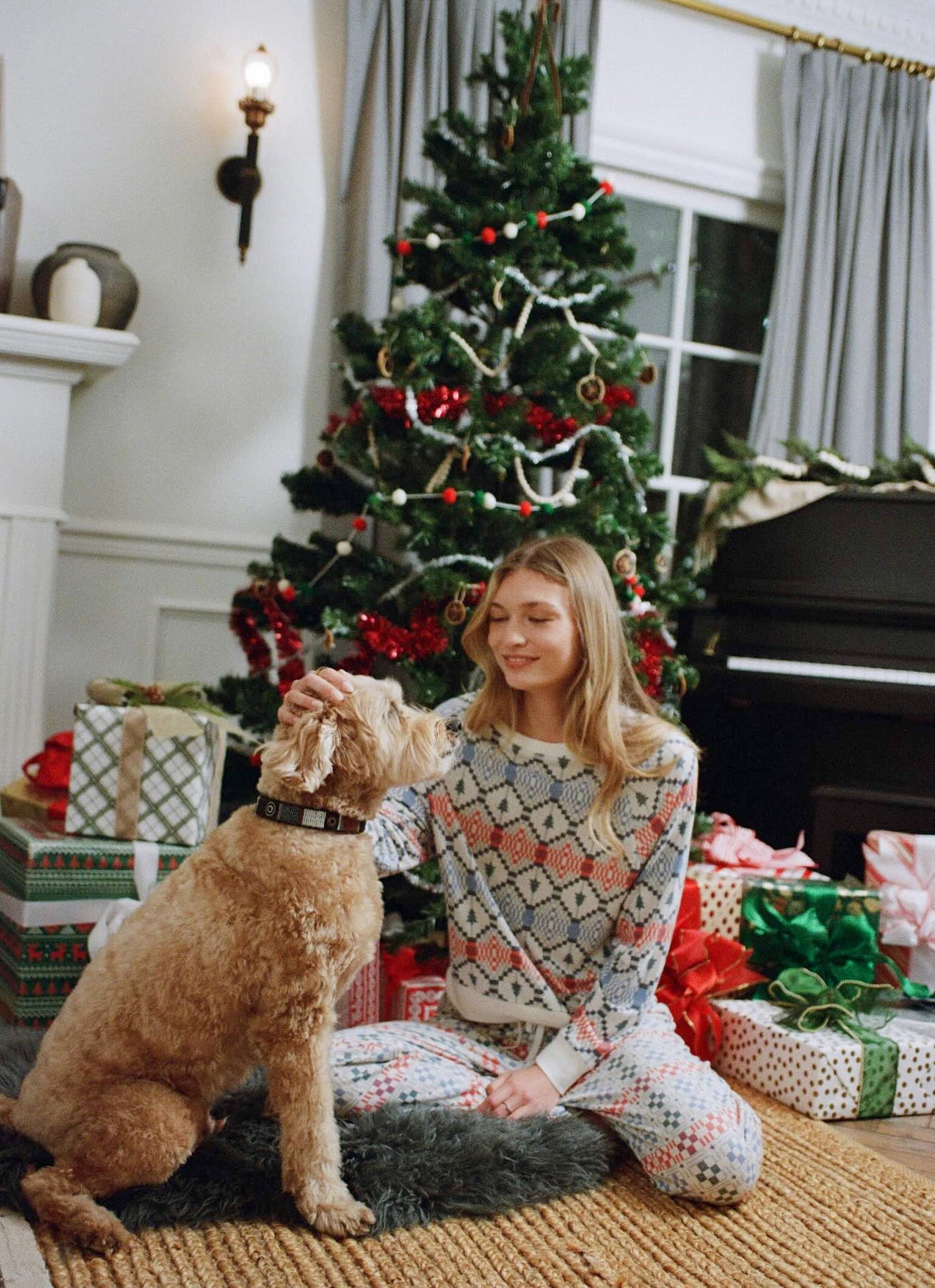 - Lightweight, cozy knit long sleeve top and pant pajama set in coordinating multicolor geometric prints.